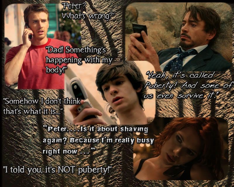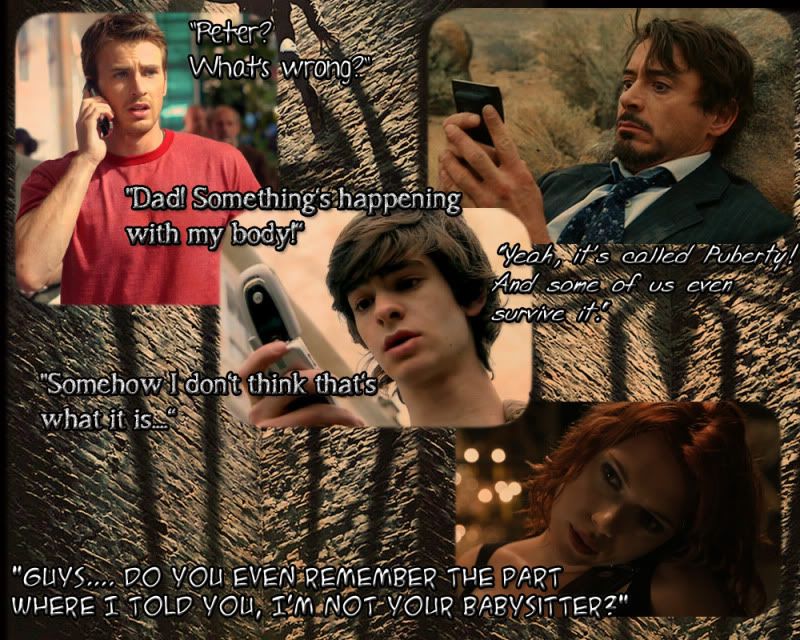Also wenn du Bilder von Thor/Bruce/Clint mit Telefon findest - her damit. Dann bau ich die mit ein. *g* Dann sieht es vllt mehr nach "Avengers taking care of Spidey" aus.