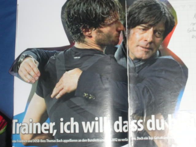 Egal, danke für das Bild! Ich liebe es. Irgendwie denke ich immer, der Jogi dreht sich weg, weil er den Arne sonst mitten auf dem Spielfeld unter den Augen der gesamten Nation geküsst hätte. Oder der Arne flüstert ihm ein paar Liebesworte ins Ohr, vielleicht sogar eine Liebesgeständnis. Oder beides... *phantasie droht amok zu laufen*